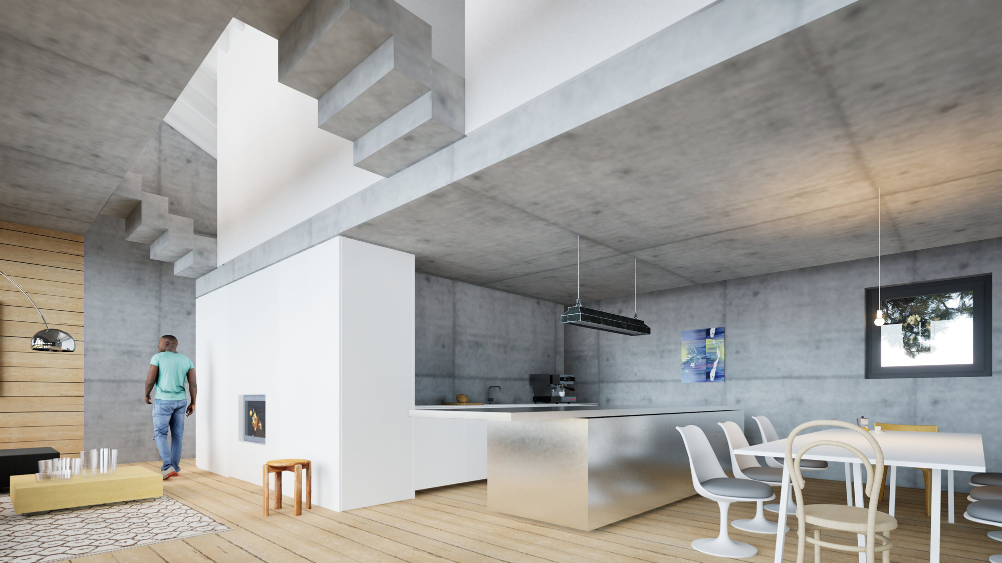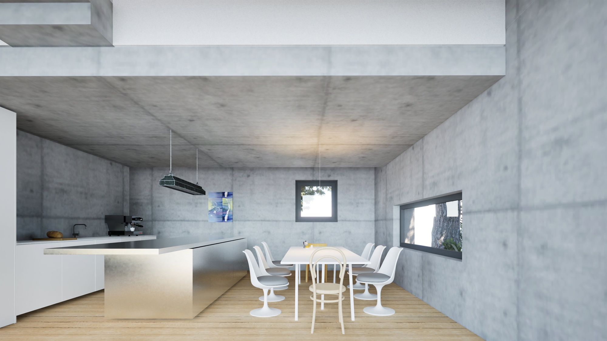 Das Ferienhaus am Malchower See in Mecklenburg-Vorpommern bietet Platz für zwei großzügige, loftartige Wohnungen, die sich jeweils über zwei Geschosse erstrecken. Die Lofts sind geprägt durch die vollständig verglaste Südfassade, die einen weitläufigen Blick auf die umgebende Landschaft und den Malchower See freigibt. Der Wohnraum verschmilzt so mit dem naturbelassenem Garten. Der Blickbezug ist auch aus dem Obergeschoss - direkt aus dem Bett, der Dusche und der Wanne - möglich. Die tragenden Betonwände und -decken bleiben sichtbar, ebenso die Dachkonstruktion, die lediglich hell gestrichen wird. Die Böden werden mit Massivholzdielen belegt. Einfach, roh, kostengünstig und dennoch oder gerade deswegen wohltuend gemütlich.