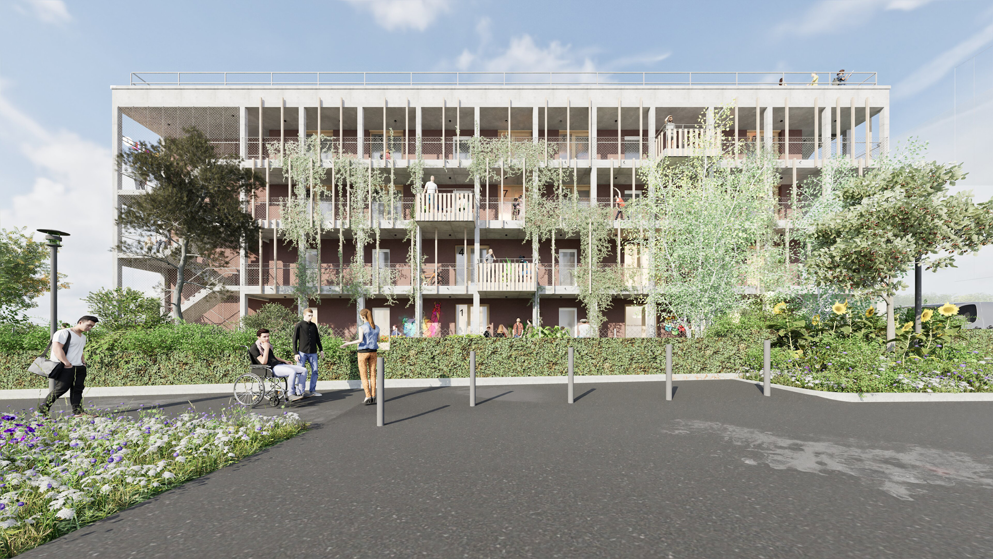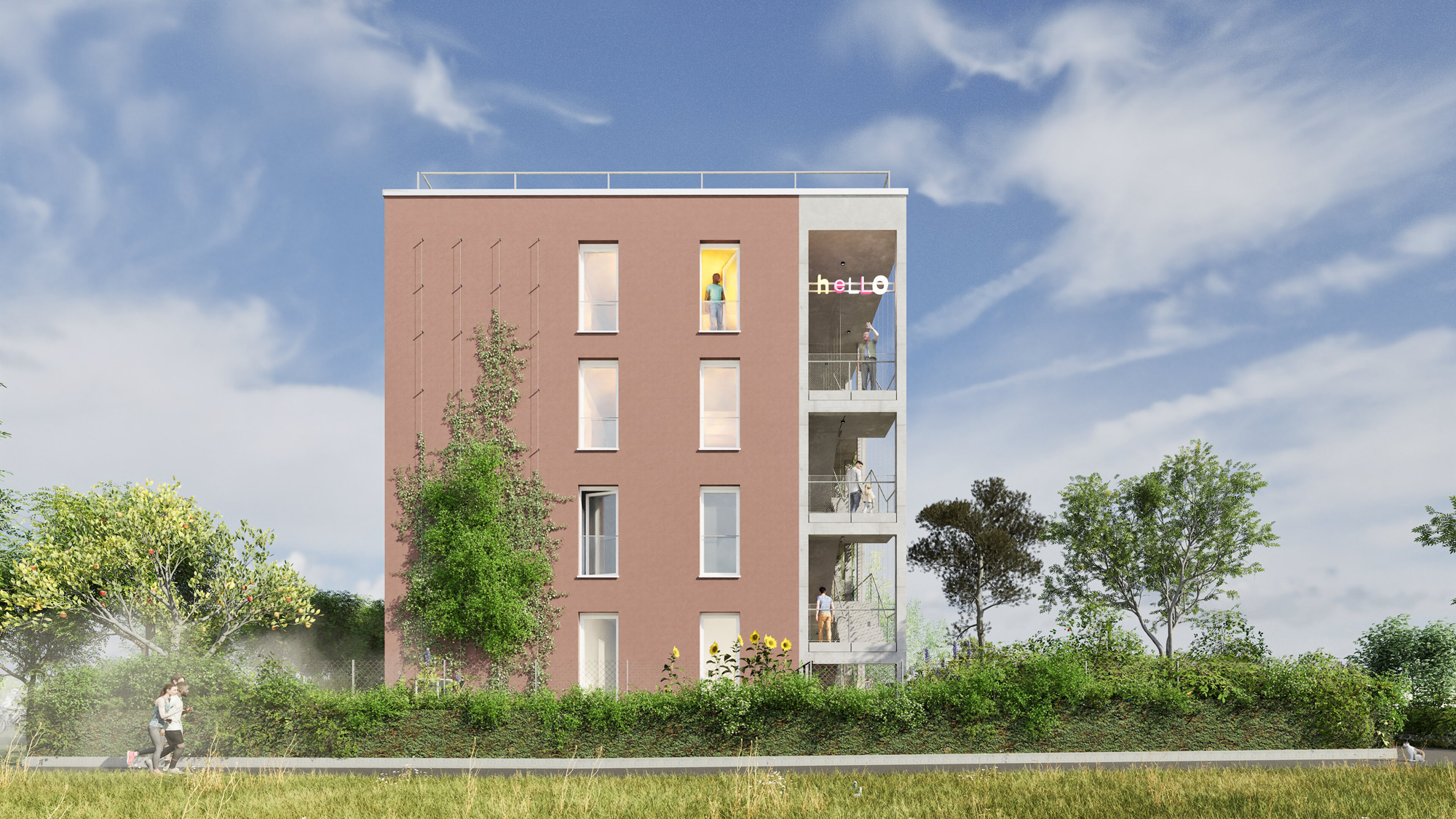 Für den viergeschossigen Baukörper mit Kellergeschoss und 15 Wohneinheiten wurde Ende 2024 die Baugenehmigung erteilt und 2025 die Ausführungsplanung erstellt. Der Neubau wird durch zwei außenliegende Treppenhäuser und einen Aufzug erschlossen, so dass alle Wohnungen barrierefrei erreichbar sind. Zur neuen Erschließungsstraße und dem Gemeinschaftsgarten bildet sich als eindeutiges, räumliches Bekenntnis für die Gemeinschaft ein großzügiger Laubengang mit vorspringenden Freisitzen aus. Zusätzliche Privatbalkone auf der gegenüberliegenden Seite der in Ost-West-Richtung durchgesteckten Wohnungen, die dem gemeinschaftlichen Raum Kraft entziehen würden, sind bewusst vermieden.