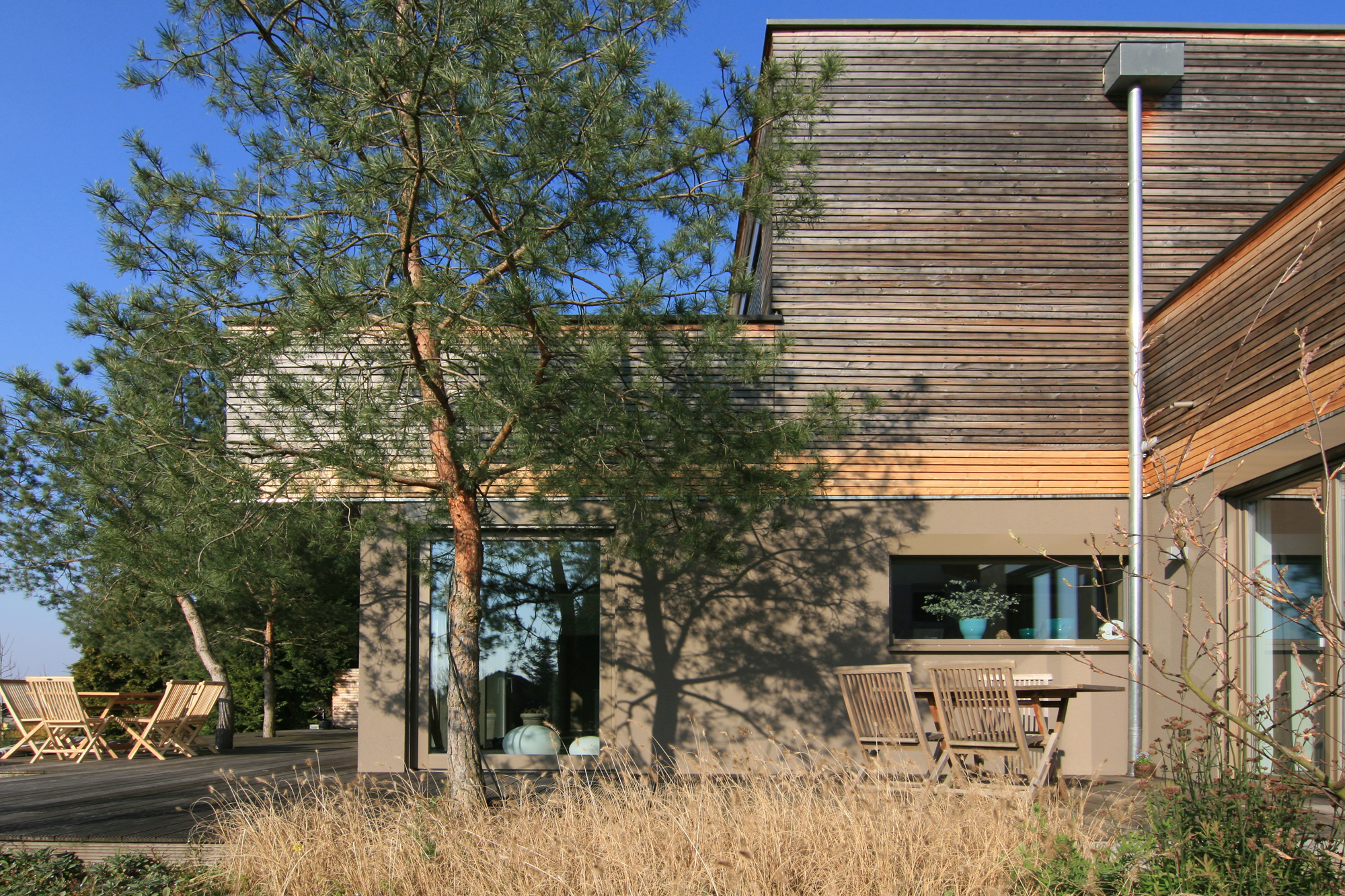 Alle Außenwandbauteile des Erdgeschosses (Putz, Fenster, Jalousiekästen) wurden im selben Farbton beschichtet. Die Lärchenholzverschalung der Dachgeschossfassade wiederholt sich in den Terrassenbelägen. Die neu gepflanzten Kiefern bieten Sonnen- und Blickschutz zugleich.
