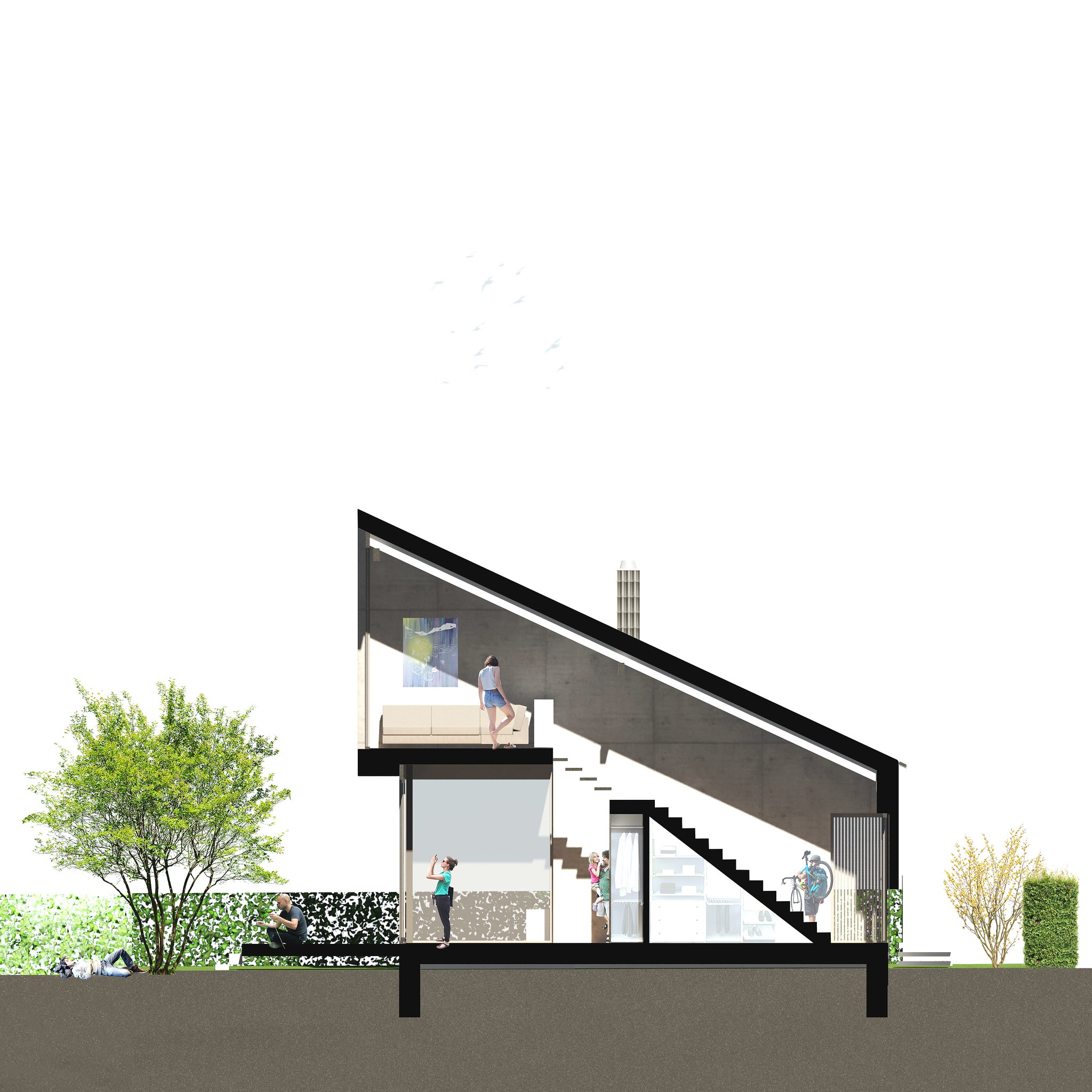 Das Ferienhaus am Malchower See in Mecklenburg-Vorpommern  bietet Platz für zwei großzügige, loftartige Wohnungen, die sich jeweils über zwei Geschosse erstrecken. Die Lofts sind geprägt durch die vollständig verglaste Südfassade, die einen weitläufigen Blick auf die umgebende Landschaft und den Malchower See freigibt. Der Wohnraum verschmilzt so mit dem naturbelassenem Garten. Der Blickbezug ist auch aus dem Obergeschoss - direkt aus dem Bett, der Dusche und der Wanne - möglich. Die tragenden Betonwände und -decken bleiben sichtbar, ebenso die Dachkonstruktion, die lediglich hell gestrichen wird. Die Böden werden mit Massivholzdielen belegt. Einfach, roh, kostengünstig und dennoch oder gerade deswegen wohltuend gemütlich.