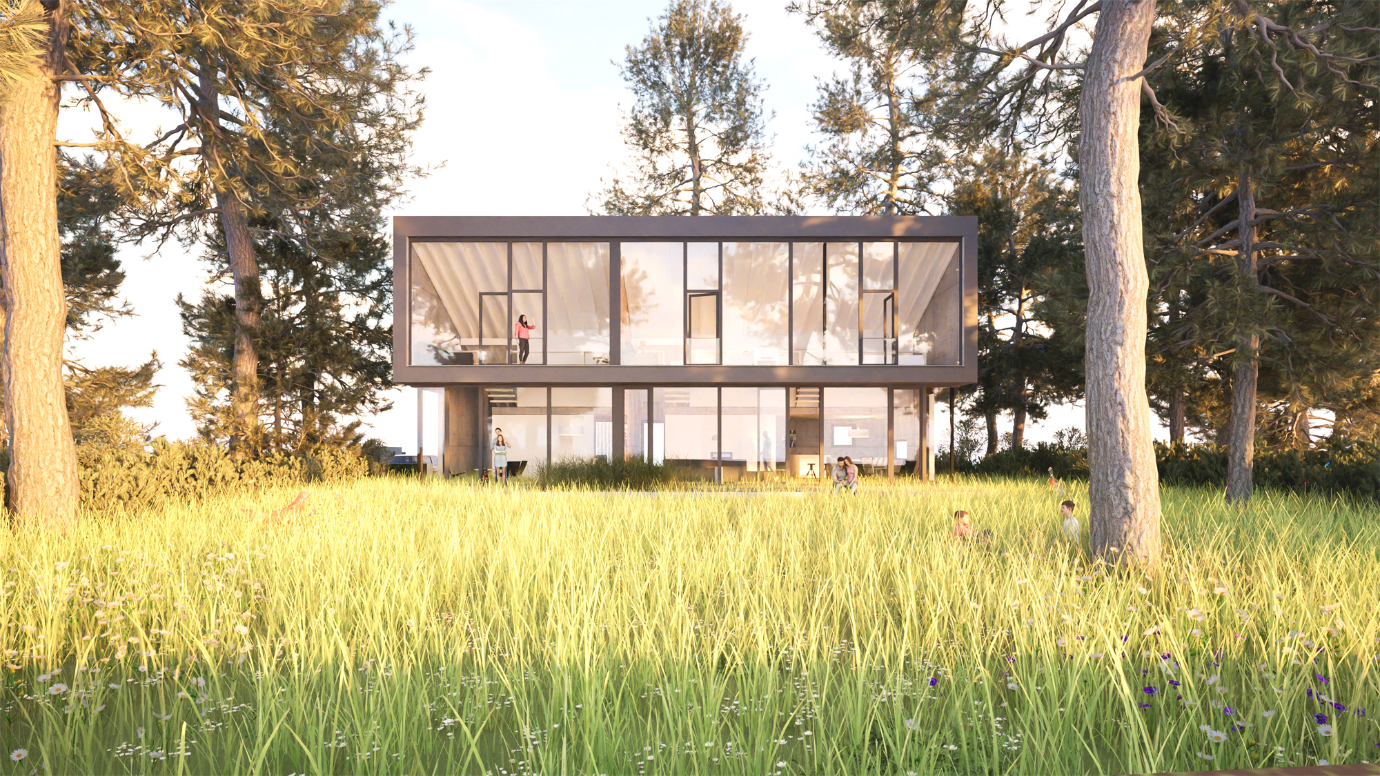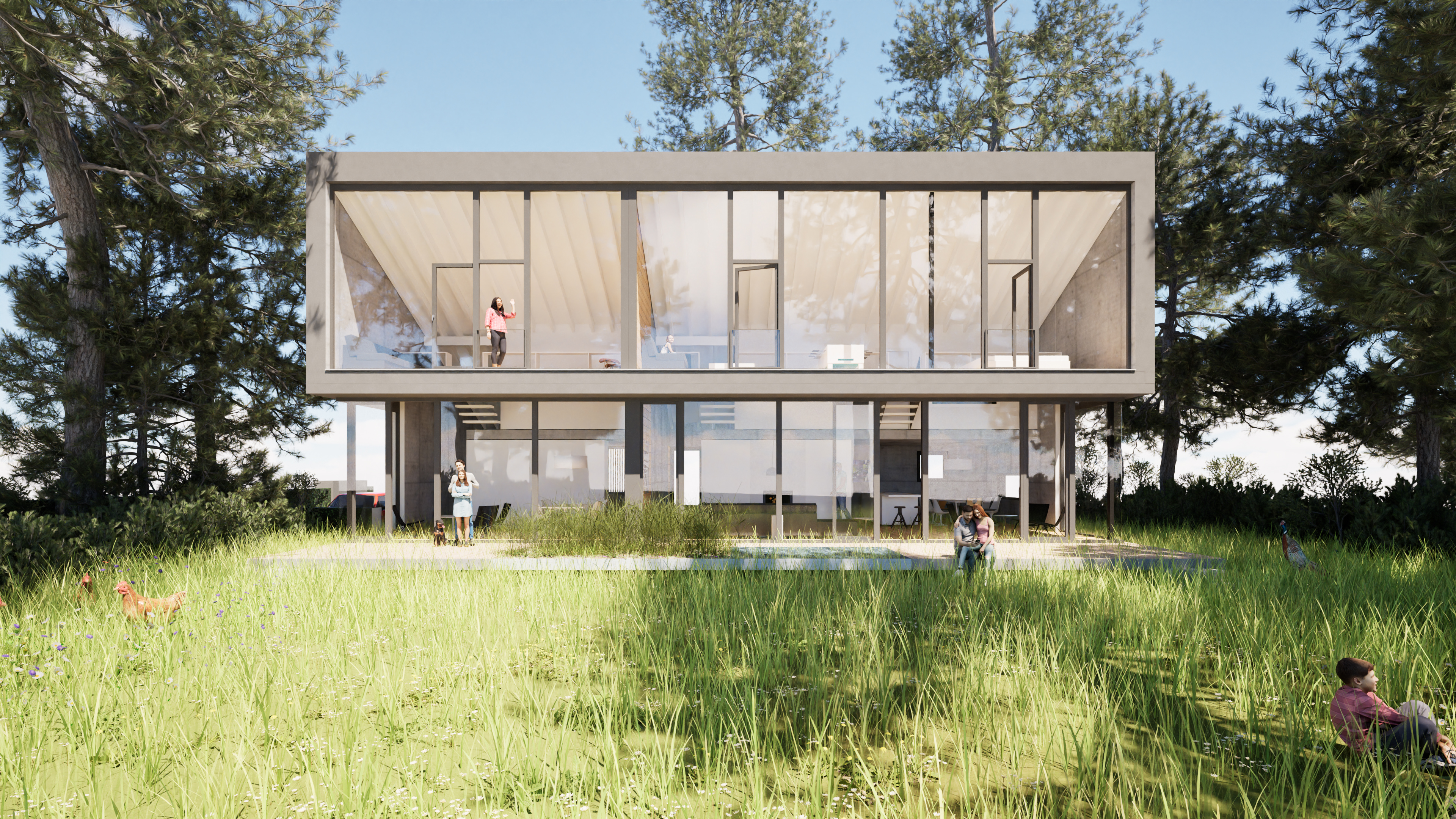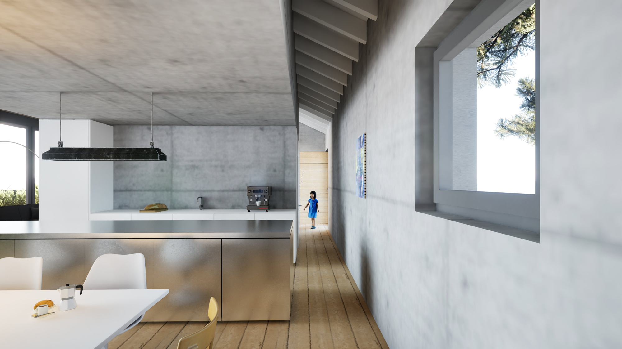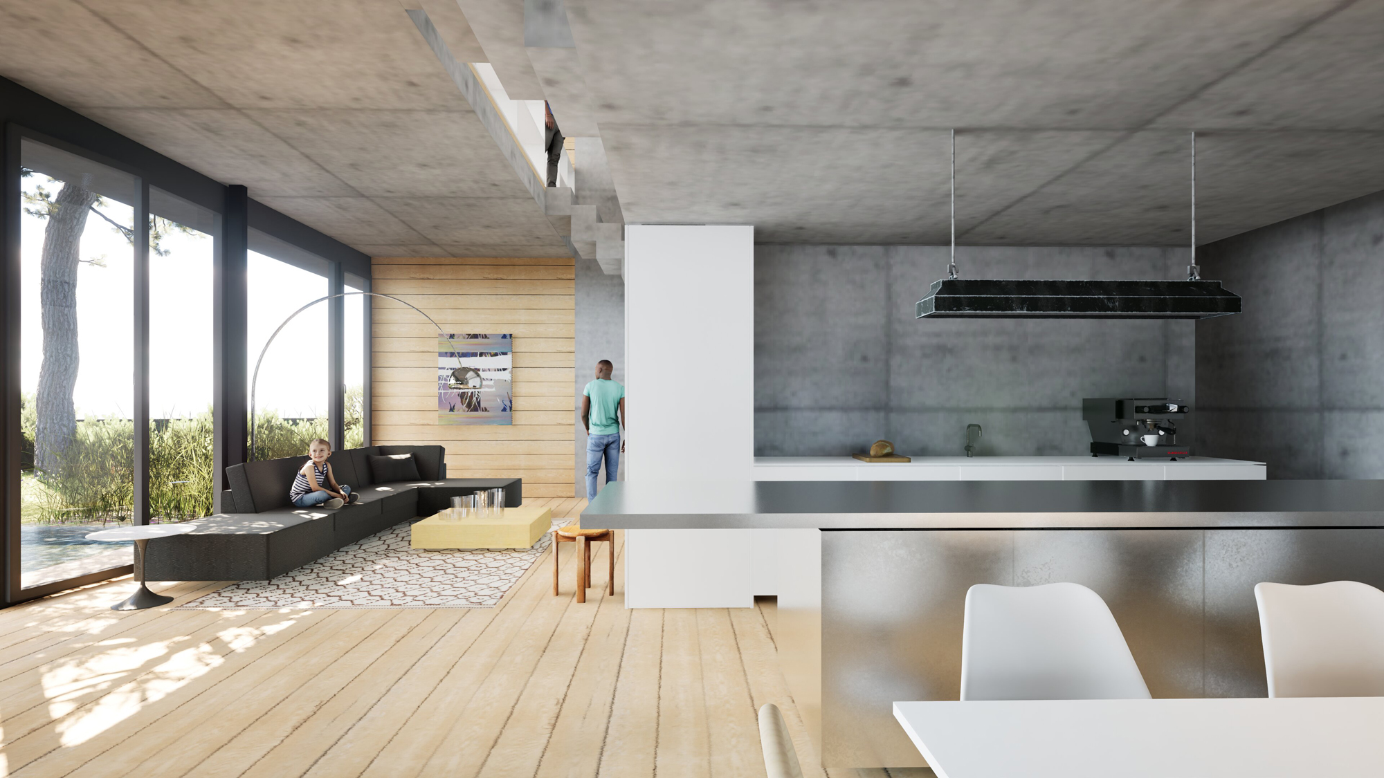 Das Ferienhaus am Malchower See in Mecklenburg-Vorpommern bietet Platz für zwei großzügige, loftartige Wohnungen, die sich jeweils über zwei Geschosse erstrecken. Die Lofts sind geprägt durch die vollständig verglaste Südfassade, die einen weitläufigen Blick auf die umgebende Landschaft und den Malchower See freigibt. Der Wohnraum verschmilzt so mit dem naturbelassenem Garten. Der Blickbezug ist auch aus dem Obergeschoss - direkt aus dem Bett, der Dusche und der Wanne - möglich. Die tragenden Betonwände und -decken bleiben sichtbar, ebenso die Dachkonstruktion, die lediglich hell gestrichen wird. Die Böden werden mit Massivholzdielen belegt. Einfach, roh, kostengünstig und dennoch oder gerade deswegen wohltuend gemütlich.
