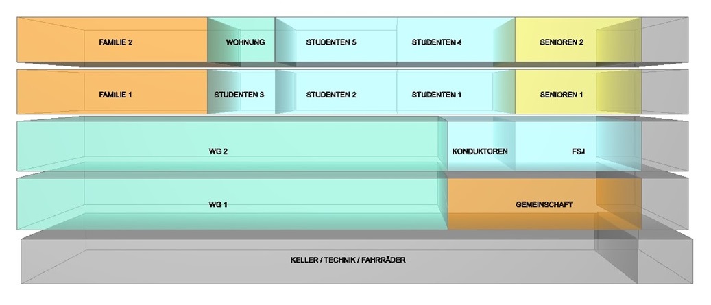 Für den viergeschossigen Baukörper mit Kellergeschoss und 15 Wohneinheiten wurde Ende 2024 die Baugenehmigung erteilt. Der Neubau wird durch zwei außenliegende Treppenhäuser und einen Aufzug erschlossen, so dass alle Wohnungen barrierefrei erreichbar sind. Zur neuen Erschließungsstraße und dem Gemeinschaftsgarten bildet sich als eindeutiges, räumliches Bekenntnis für die Gemeinschaft ein großzügiger Laubengang mit vorspringenden Freisitzen aus. Zusätzliche Privatbalkone auf der gegenüberliegenden Seite der in Ost-West-Richtung durchgesteckten Wohnungen, die dem gemeinschaftlichen Raum Kraft entziehen würden, sind bewusst vermieden.